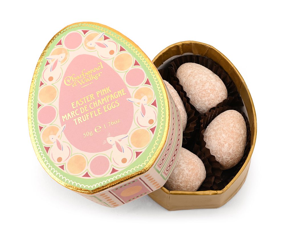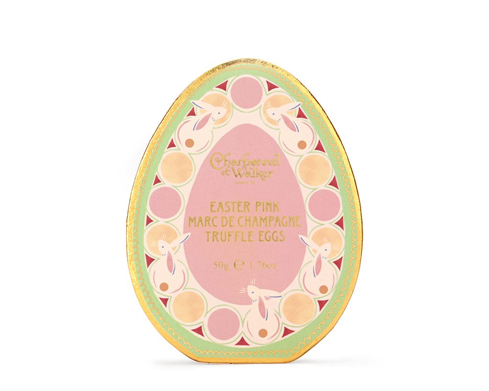 Joyful rabbits adorn this pretty Easter Egg shaped gift box. Filled with four Pink Marc de Champagne Truffles (white chocolate truffles with natural vanilla and strawberry flavour with Marc de Champagne centre). Celebrate this special time of year with a delicious Easter gift.