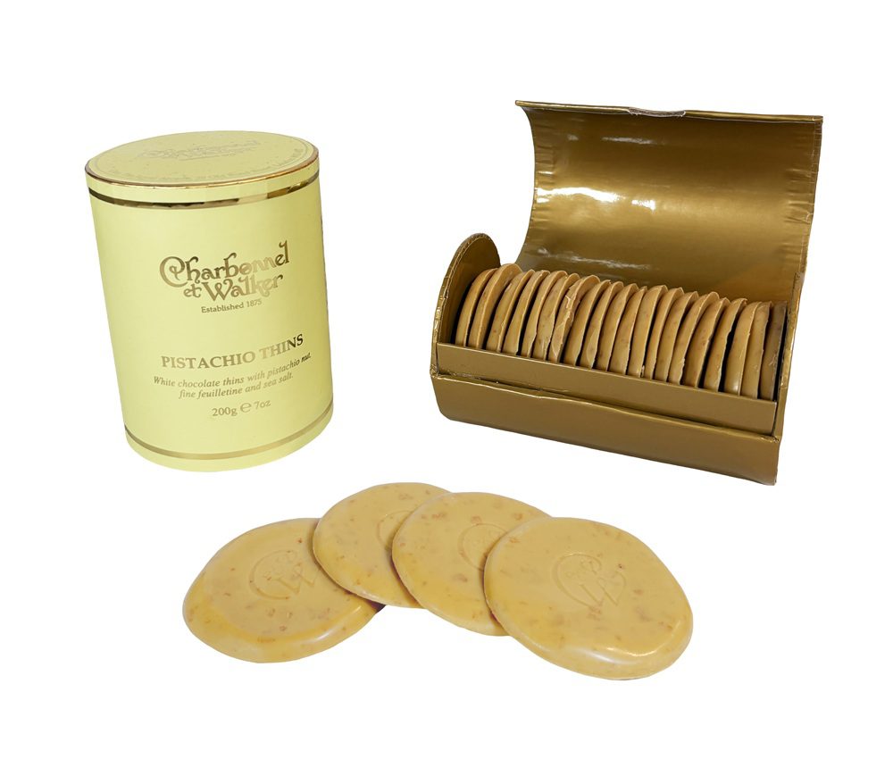 These new Pistachio Thins are exceptionally delicious. Delectable discs of White Chocolate infused with Pistachio and natural vanilla flavouring. Once tried, forever smitten. Perfect as an After Dinner treat or to celebrate important occasions. Suitable for Vegetarians and without alcohol.