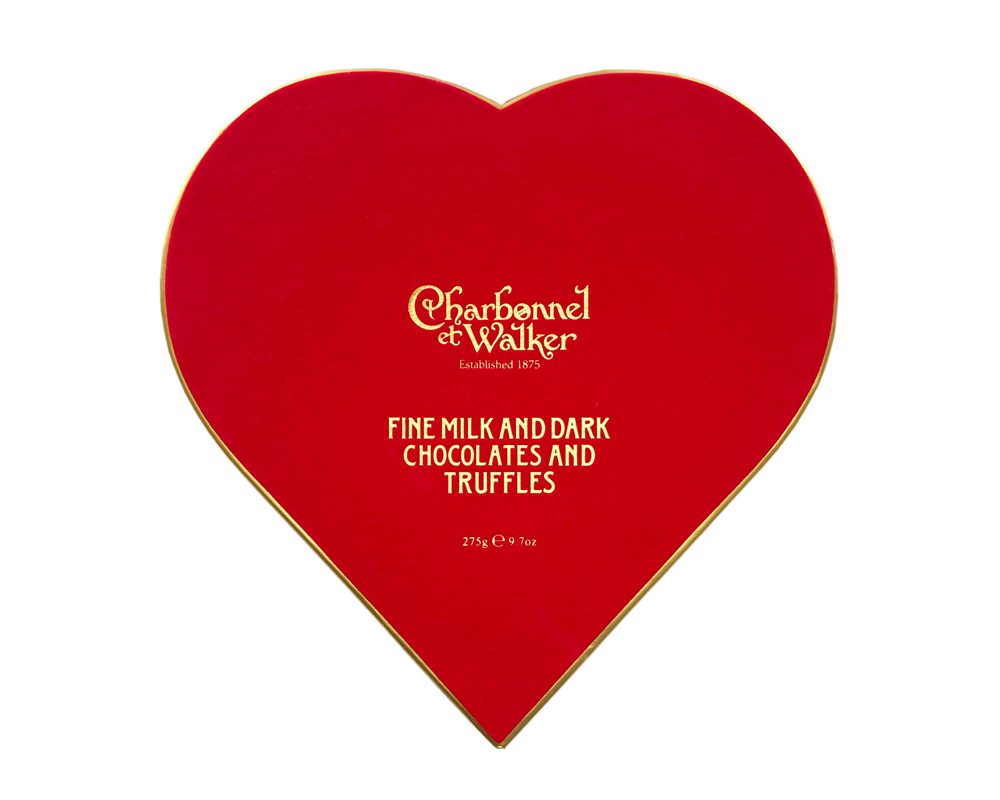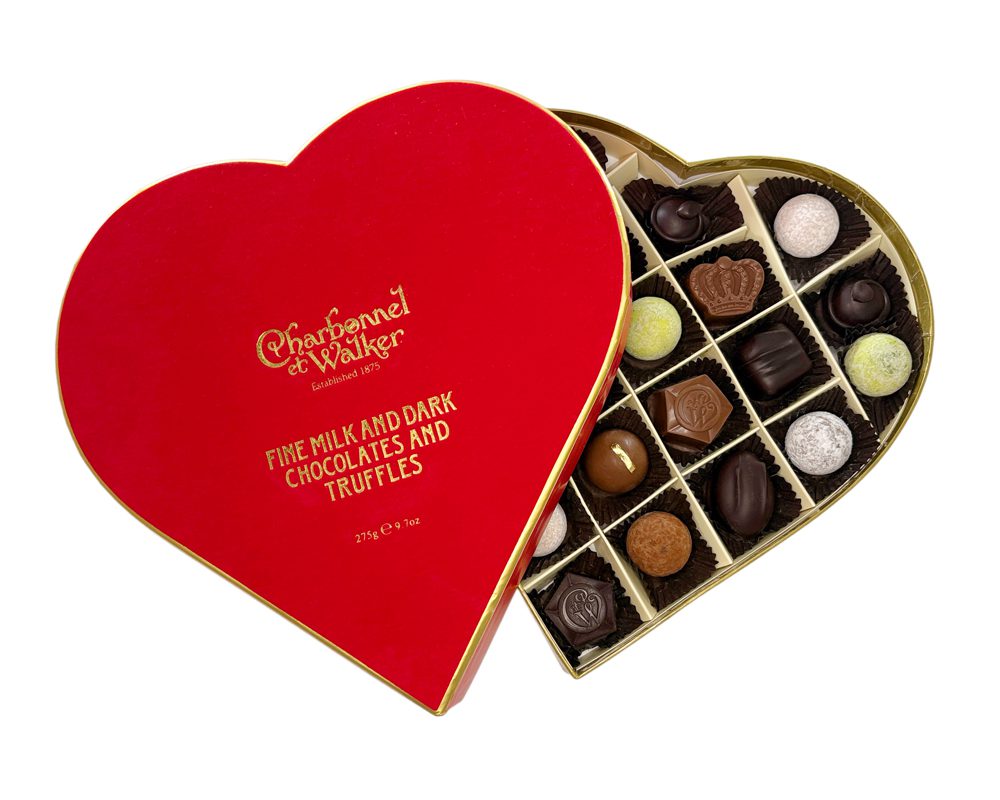 A sumptuous, elegant red velvet heart filled with our finest selection of Milk and Dark Chocolates and Truffles.  Favourites include Milk and Dark Chocolate Crowns, Dark Orange Cream, Dark Fudge Vanille, Strawberry Truffle, Milk Hazelnut Cream Truffle with edible gold leaf, Dark Framboise and more. A superlative gift this Valentine’s.
