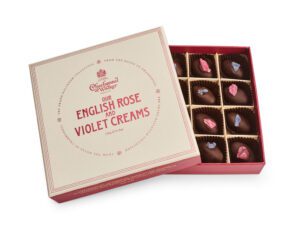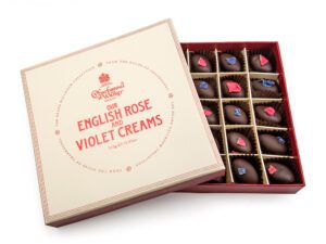 Quintessentially English Rose and Violet Creams. A unique fondant recipe infused with the attar of Roses and Violets. Exquisitely enrobed in a beautiful Fine Dark Chocolate.Grand Ballroom Fine English Rose and Violet Creams – 185g