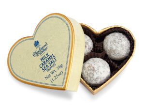 Oh so delicious Milk Chocolate truffles with a caramel and sea salt centre lightly dusted in icing sugar, in a delightful mini heart shaped box.Milk Sea Salt Caramel Chocolate Truffles – Cream Mini Heart