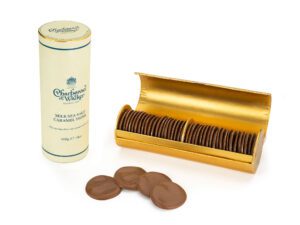 Delicious wafer thin discs of our delicious Milk Chocolate infused with Sea Salt. Perfect as an After Dinner treat.Milk Sea Salt Caramel Thins – 200g