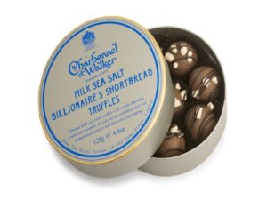 One of our most deliciously decadent truffles! Each one is enrobed in Fine Milk Chocolate with a Milk Chocolate, Biscuit and Sea Salt Caramel centre and decorated with coated Biscuit…Billionaires Truffles