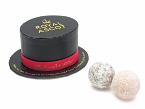 Delight with this limited edition Royal Ascot Top Hat. Perfectly polished and filled with a Strawberries & Cream Truffle and a Milk Sea Salt Caramel Truffle.Royal Ascot Top Hat